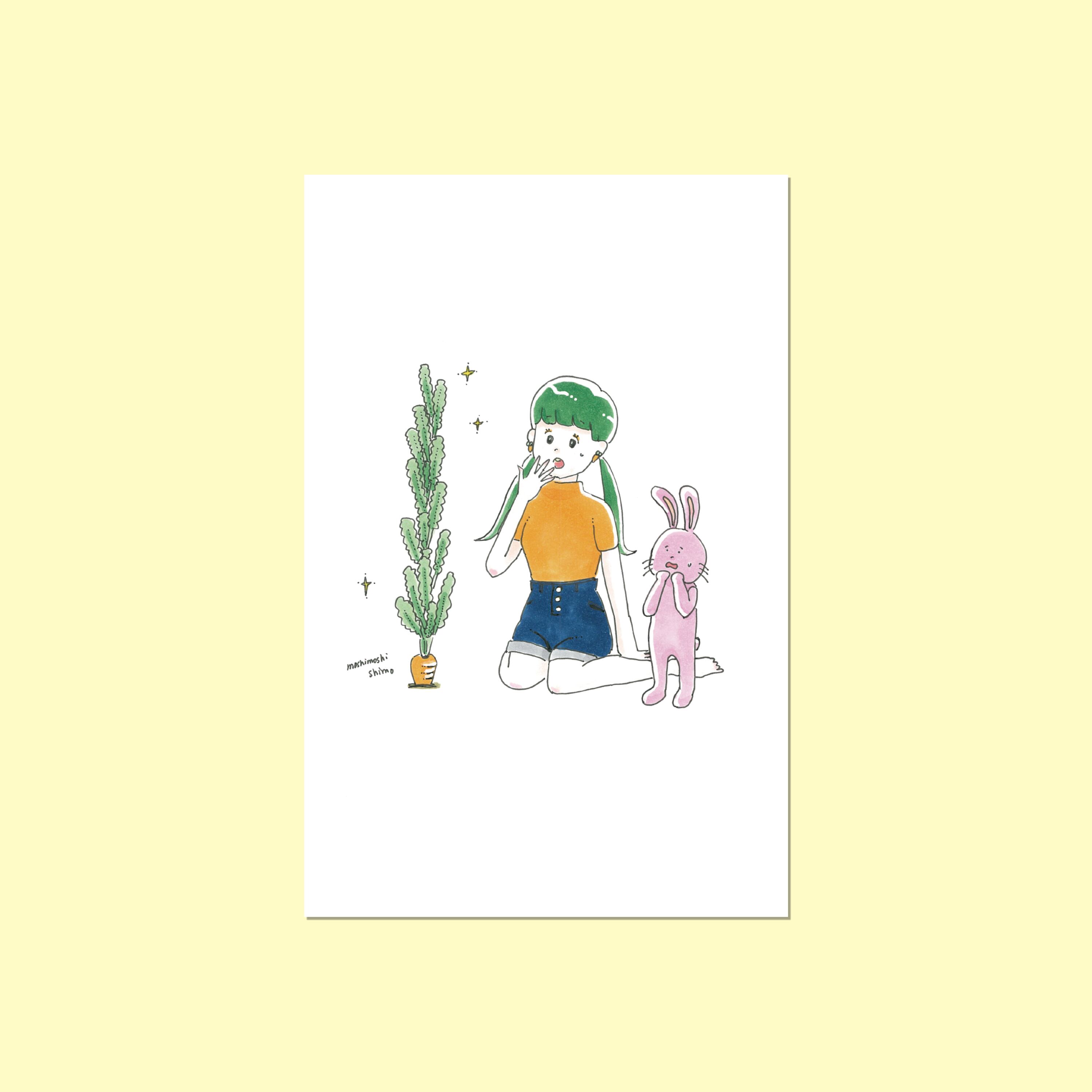 にんじんが育ちすぎて驚いている女の子とウサギのイラストです。